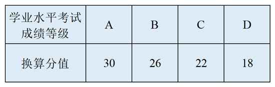 普高招生考生高中學考成績(滿分300分)=各科成績等級換算分值相加的總和(信息技術與通用技術學考分設的考生,信息技術與通用技術成績等級換算分值以50%計)。各科成績等級轉換成分數如下表所示: