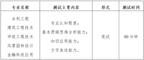 高職提前招生綜合測評由學校自主命題并組織考試,命題與閱卷工作由學校上報浙江省教育考試院備案,自主組織或委托有資質的機構實施。普高招生考生主要測試職業(yè)適應性,單獨考試招生考生重點考核文化素質。測評內容、方式及分值如下: