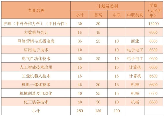 學(xué)校2023年高職提前招生總計(jì)劃280名,其中普高招生考生計(jì)劃180名,單獨(dú)考試招生考生計(jì)劃100名,具體如下: