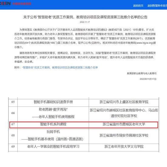 教育部發(fā)布了《關于公布“智慧助老”優(yōu)質工作案例、教育培訓項目及課程資源第三批推介名單的公告》。溫州市鹿城區(qū)老年大學報送的智慧助老優(yōu)質課程資源——《智能手機系列課程》成功入選。
