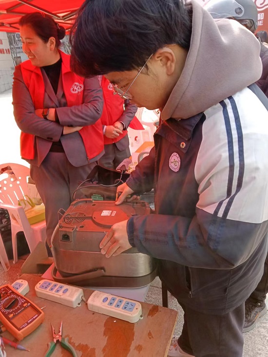 “老師,你幫我看看這個電飯鍋還能不能‘搶救’一下?”,“小師傅,我小孫子的這個小摩托車能幫忙看看問題出在哪里嗎?”服務(wù)現(xiàn)場,聞訊趕來的群眾陸陸續(xù)續(xù)從家中拿來不能正常運(yùn)轉(zhuǎn)的電飯煲、電風(fēng)扇、燒水壺等小家電,讓志愿者們“診斷”。志愿者們認(rèn)真通過“望聞問切”查找故障原因,仔細(xì)分析每一件小家電存在的問題,利用所學(xué)技術(shù)處理檢查出的問題。同時,志愿者們還耐心地向大家講解家電日常使用和保養(yǎng)方法,普及用電安全知識,避免在使用過程中因不恰當(dāng)?shù)氖褂梅椒ㄔ斐蓚皳p失。一位老爺爺激動地說,“感謝小同學(xué),幫我修好了刮胡器。能在職校學(xué)一門技術(shù),真好,真好!”