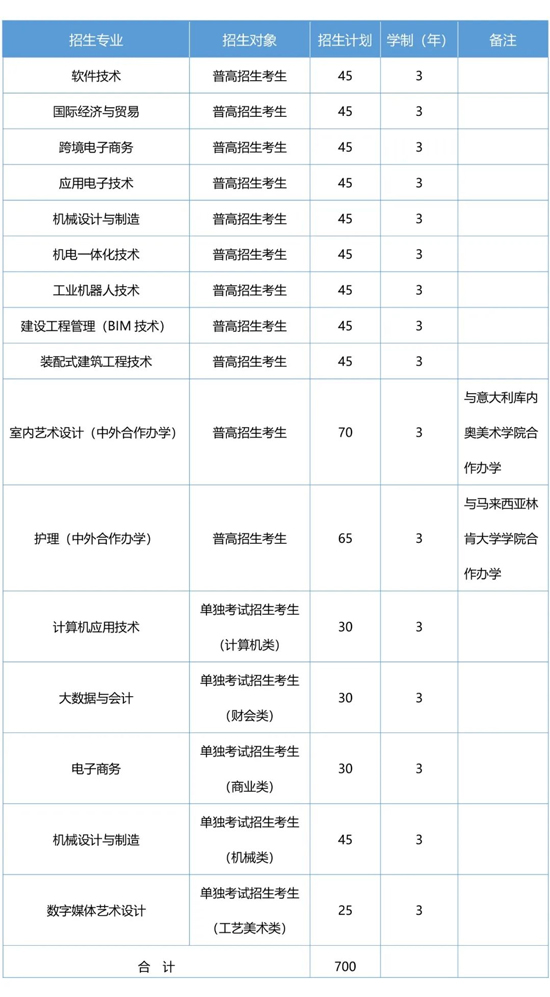 第五條 經(jīng)浙江省招生主管部門批準(zhǔn),我校2023年面向浙江省高職提前招生計(jì)劃700名,招收普高招生考生和單獨(dú)考試招生考生,具體招生計(jì)劃如下:
