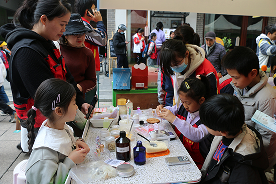 活動地點,該校設有4個志愿攤位,由四個專業部分別開展親子剪紙、科普、懸灸、愛心義賣志愿服務。