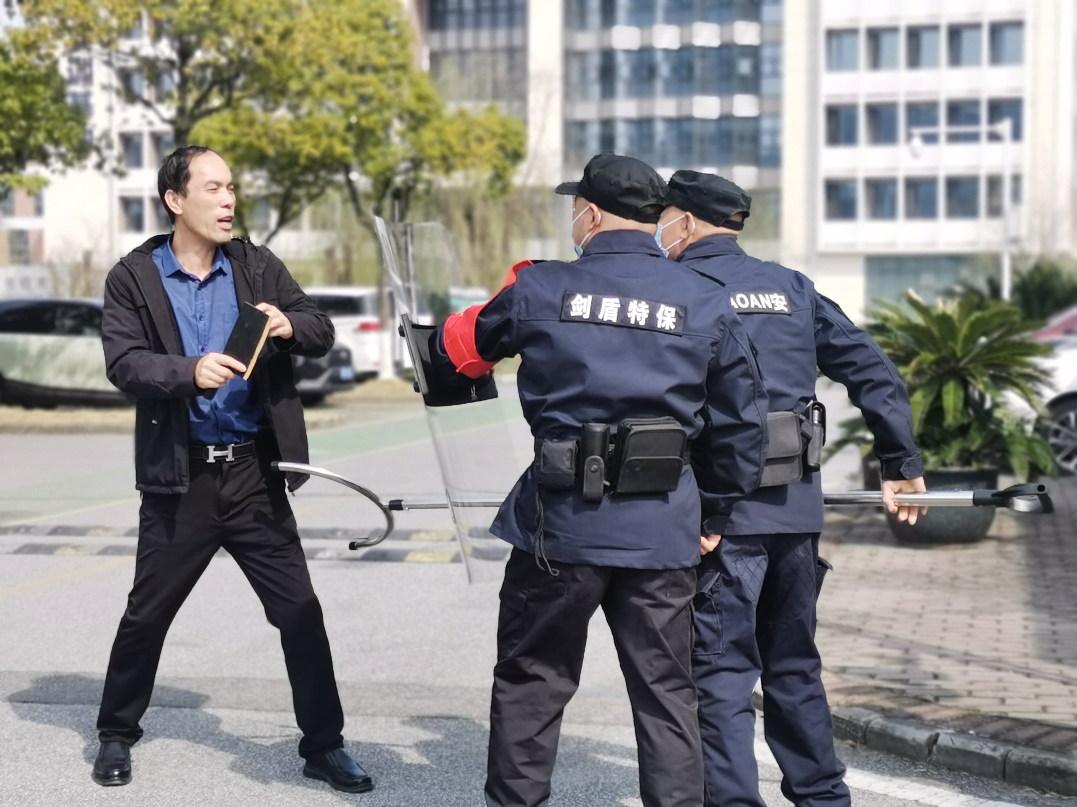 第二部分,反恐防暴應(yīng)急演練。演練活動由湖州劍盾保安服務(wù)有限公司培訓(xùn)教官敖國強進行講解、示范。仁皇山派出所唐樂峰等3位民警參與指導(dǎo),全體保安參與演練。