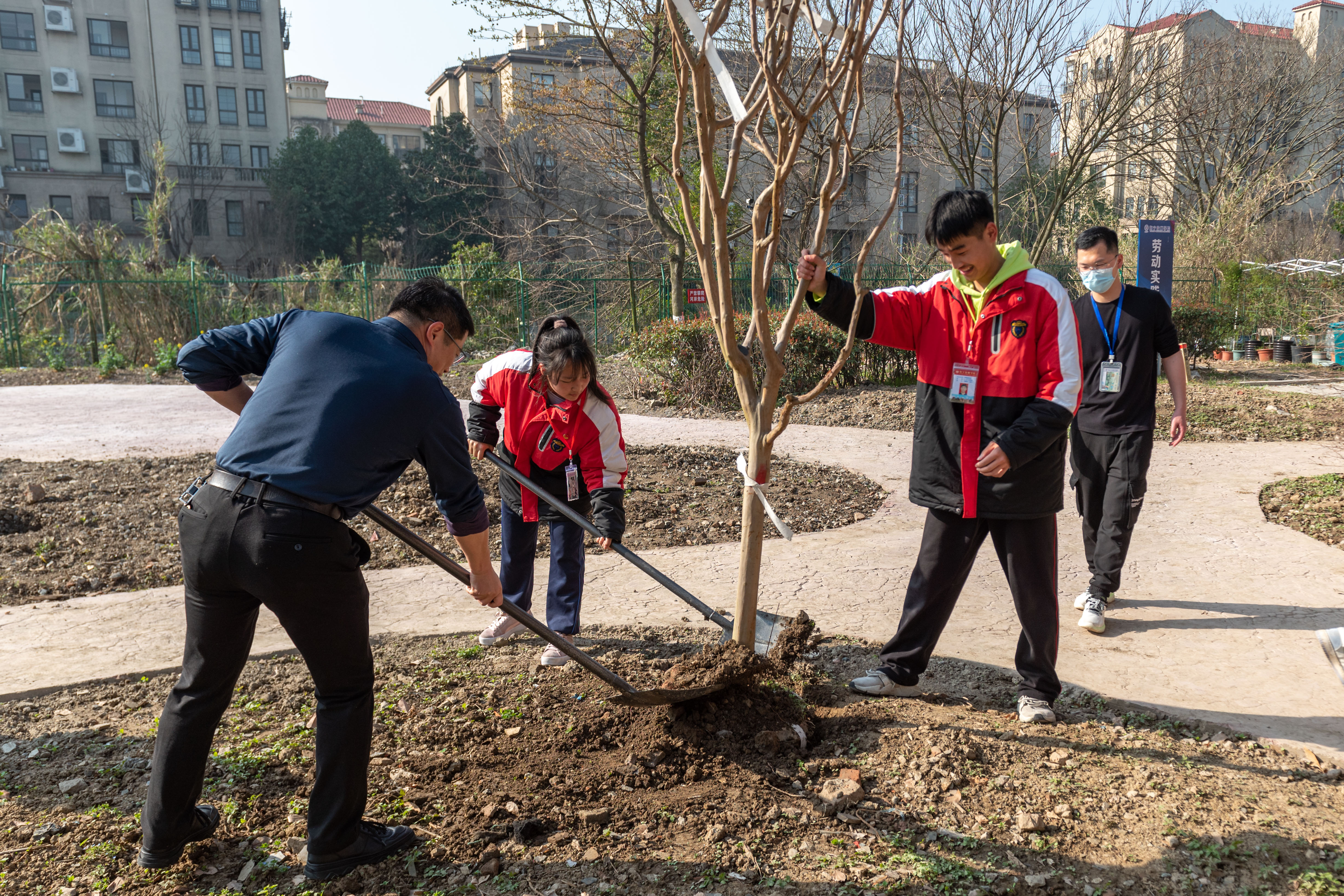揮鍬挖土、提桶抬水、填坑埋樹(shù)、灌水扶苗……大家分工協(xié)作、配合默契,在歡聲笑語(yǔ)中,完成了樹(shù)苗的栽種。院團(tuán)委書(shū)記洪靜老師、學(xué)生工作處負(fù)責(zé)人張文老師、烹飪旅游系主任程鋒老師,共同為“海寧黑水一家親,東西攜手傳真情”友誼林標(biāo)識(shí)牌立牌培土。