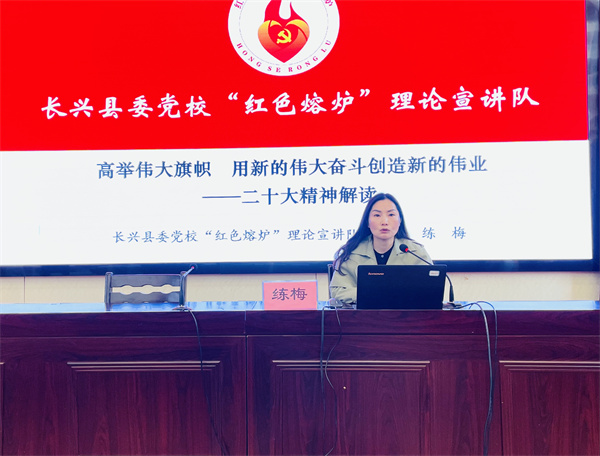春雨潤物,精神引領。培訓伊始,長興縣委黨校“紅色熔爐”理論宣講隊的成員練梅給大家帶來了一場深刻的思政培訓《高舉偉大旗幟 用新的偉大奮斗創造新的偉大——二十大精神解讀》。練老師緊扣黨的二十大報告原文,重點圍繞以中國式現代化全面推進中華民族偉大復興等方面,對黨的二十大精神進行全面系統深入的宣講解讀。主題鮮明、內涵豐富、思想深刻,具有很強的針對性和指導性,號召教師們不忘教育初心,切實將學習黨的二十大精神轉化為推進教育高質量發展的強大動能。