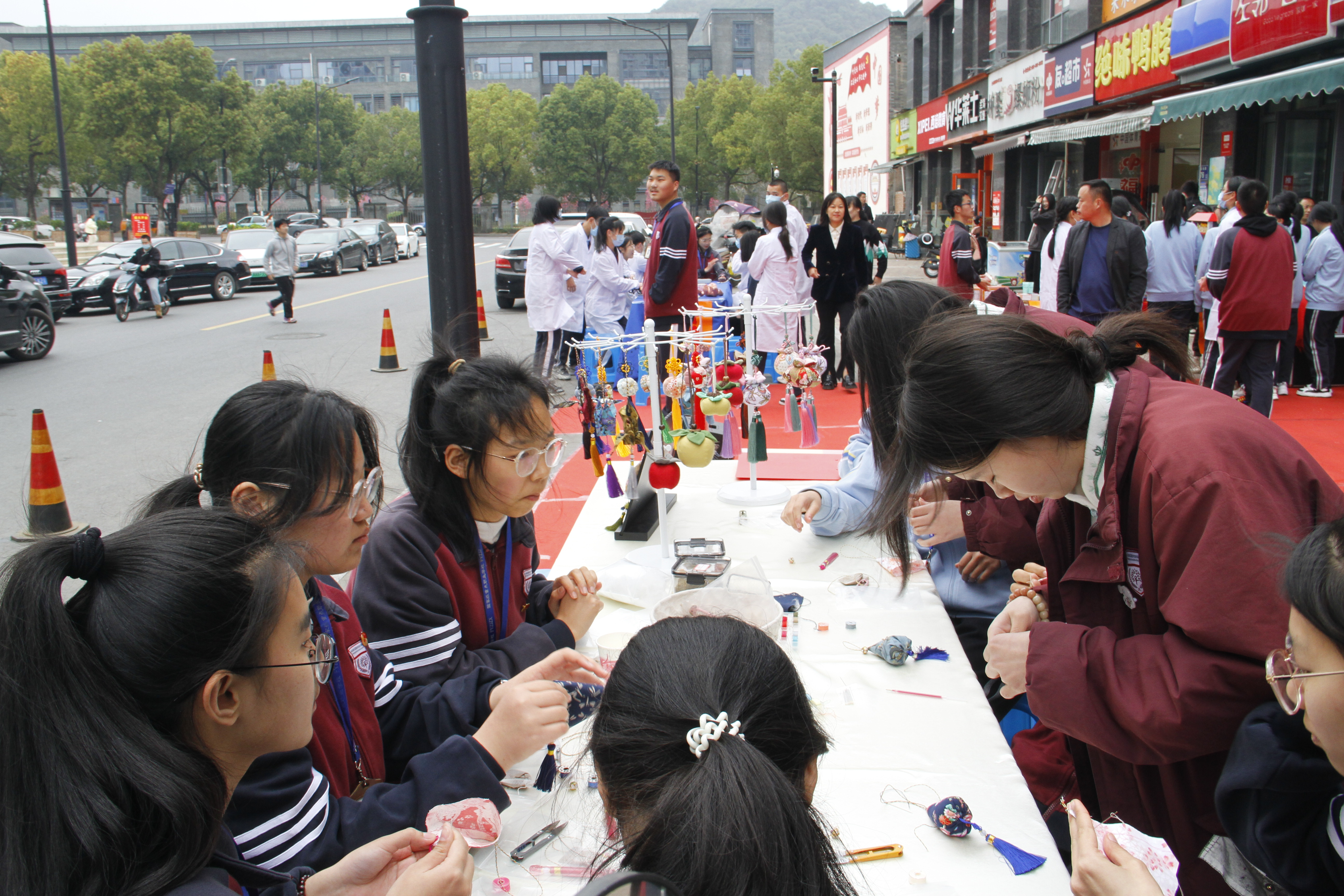 揭牌儀式后,學校志愿服務隊聯合楚濟堂醫藥發展有限公司提供了推拿、量血壓、健康咨詢、香囊制作等志愿服務,來往的市民紛紛前來參與。中醫康復養生專業的學生們通過推拿結合保健知識普及的方式,熱情地為群眾進行搓、揉、拿、捏等技法的推拿服務,嫻熟的技藝使忙碌的人們放松了身心。同時,提供量血壓、健康檢測服務的學生們還仔細地向市民講解定期檢查身體的重要性,鼓勵大家樹立樂觀的生活態度,養成健康的生活習慣。服裝專業的學生們則是手把手向來往市民傳授香囊制作的方法。活動現場暖意滿滿,歡樂有趣。