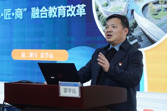隨后,學(xué)校校長雷學(xué)遠(yuǎn)做《基于“新混合所有制”的“禮·匠·商”融合教育改革》主題講座。他以新《職教法》為背景,聚焦中職教育的機(jī)制、平臺、目標(biāo)三大問題,分享我校的主要做法和經(jīng)驗(yàn)啟示。