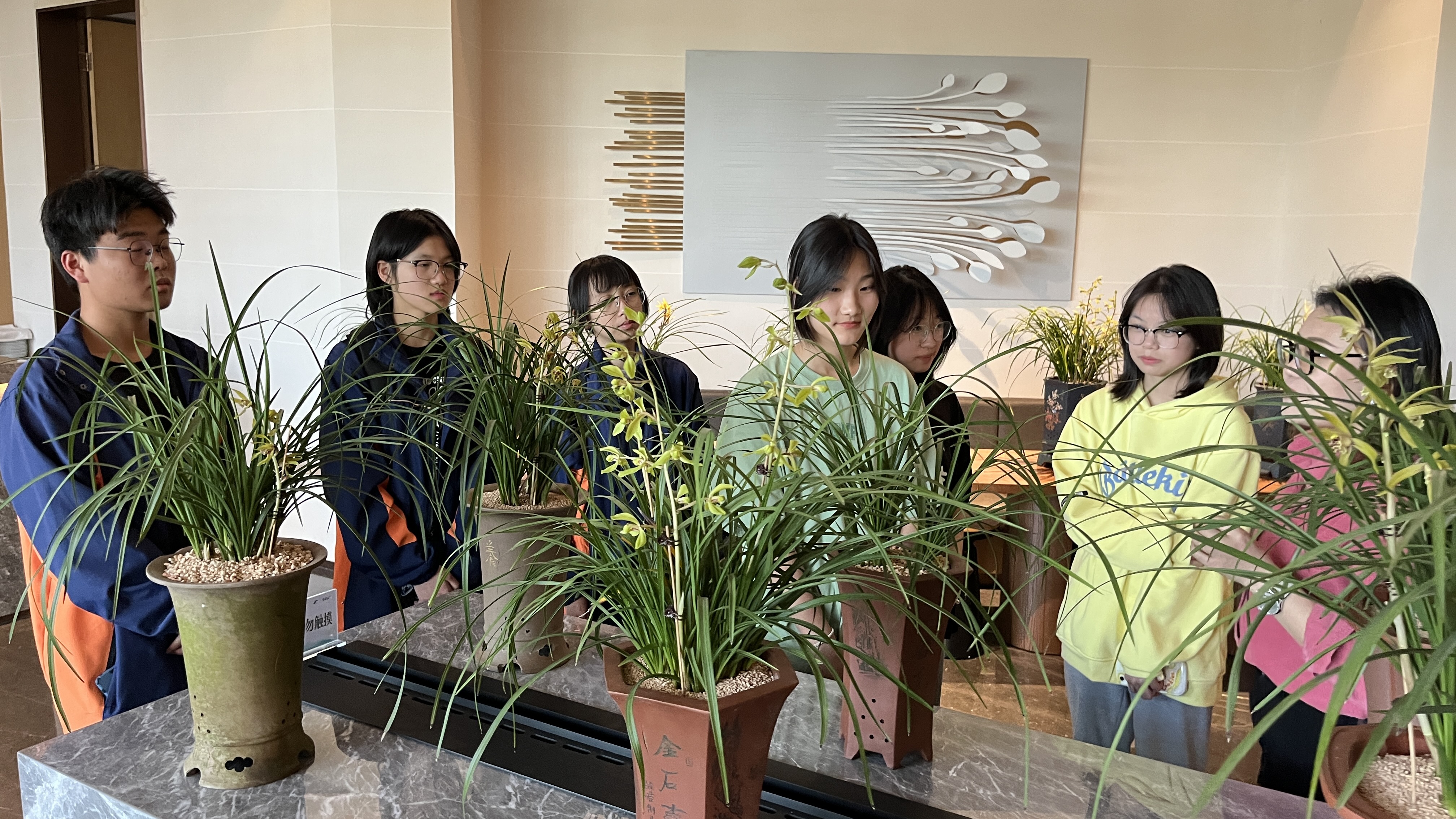 4月10日,湖州市現代農業技術學校新悠蘭花社師生代表走進政校企合作單位余不谷國際度假小鎮,參觀蕙蘭藝術展。