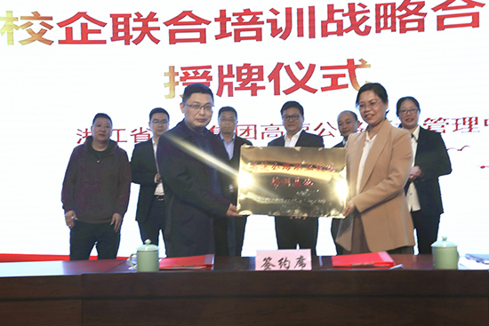 麗水中心副總經理陳建甬與黨總支書記、校長陳偉華代表雙方簽訂校企合作協議,并與黨總支副書記林偉琴進行了高速公路職業技能培訓基地的授牌儀式。