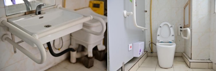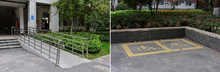入樓臺階處,增設了輪椅坡道和扶手;公共場所和綠地內,增設了無障礙輪椅席位,并新劃設出若干的無障礙車位;公共場所的衛生間里,增設了一些無障礙坐便器和小便池,并安裝安全扶桿和緊急呼叫系統。