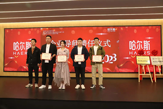 哈爾斯的八位技術(shù)專家當(dāng)場(chǎng)被聘為永康五金技師學(xué)院的“兼職講師”,永康五金技師學(xué)院的尹寶海等四位專業(yè)骨干教師則被哈爾斯聘為“企業(yè)導(dǎo)師”。