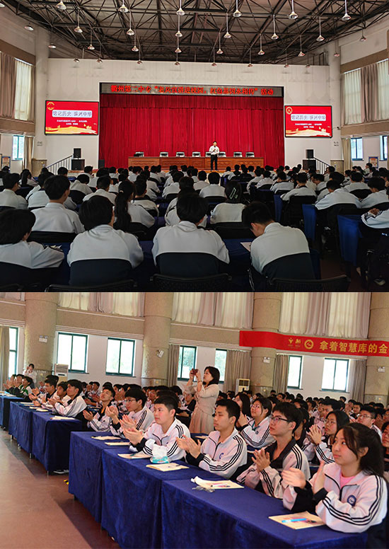 江山市關愛退役軍人協會會長曹建敏作為一名退役軍人,始終心系退役軍人和家鄉建設,被評為衢州市退役軍人就業創業導師、衢州市首屆“十佳退役士兵”。他以“銘記歷史 振興中華”為主題,講述了在中國共產黨領導下中國人民從近代史任人踐踏,到“站起來”,擁有了國家主權,到“富起來”,人民安居樂業奔小康,到“強起來”,擁有話語權,一個又一個偉大飛躍的英雄壯舉,他說:“不要小看自己,每個人都是英雄。”借此,他希望同學們銘記歷史、不忘國恥,為實現中華民族偉大復興中國夢而努力奮斗。