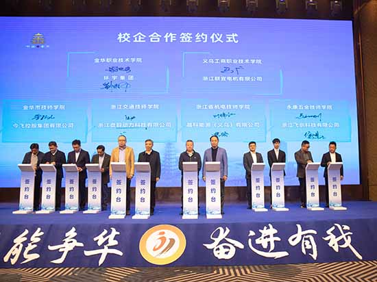 作為省一流技師學院建設單位,永康五金技師學院與浙江交通技師學院、浙江省機電技師學院、金華技師學院參加了當日的高技能人才培養(yǎng)成果展。永康五金技師學院黨委書記曹法余出席大會,院領導馬林剛代表學院與浙江飛劍科技有限公司代表上臺簽約。