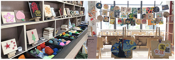 大象公社坐落在浙江金麟實(shí)業(yè)大樓中,共有三層。在公社工作人員帶領(lǐng)下,浙江省湖州藝術(shù)與設(shè)計(jì)學(xué)校“藝術(shù)+”湖創(chuàng)商城創(chuàng)業(yè)團(tuán)隊(duì)依次參觀了三層空間:第一層是漂流書吧和展示空間;第二層則為教學(xué)體驗(yàn)區(qū),涉及木作、零基礎(chǔ)丙烯畫、奶油膠、微景觀八音盒等相關(guān)內(nèi)容的教學(xué);第三層是匠心制作區(qū),包含皮具、雕刻、金工和布藝等相關(guān)作品的制作。