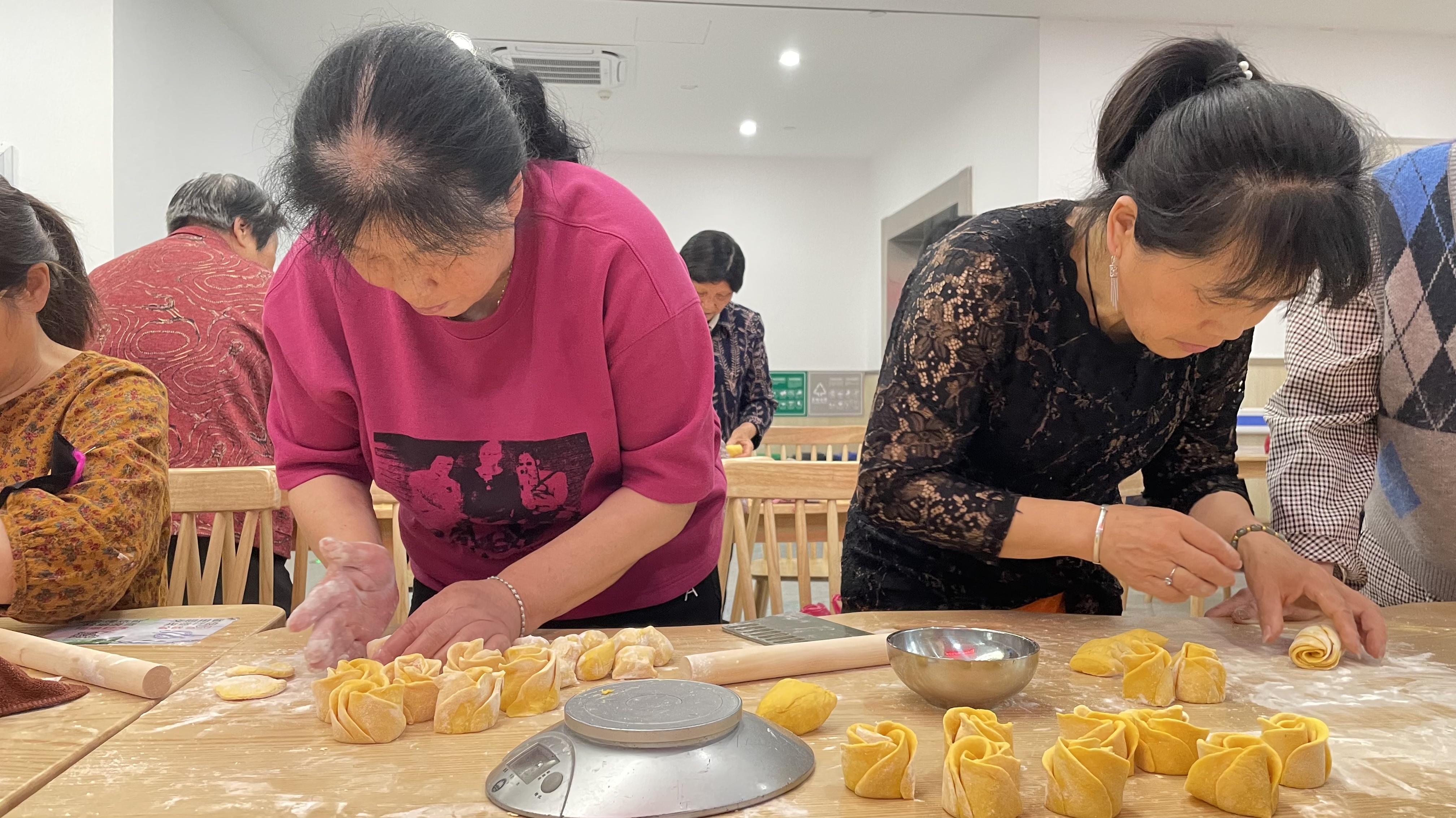面點老師將提前準備好的面粉、南瓜泥、糖、酵母等食材一一擺放好。為老人們詳細講解了制作過程,在工作人員的帶領下,老人們迅速進入狀態,大家分工明確,有人和面團、有人幫忙遞東西、有人將面團分成面劑子。