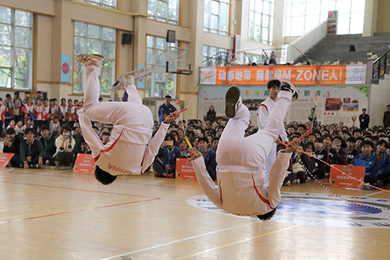 賽前,“世界冠軍進校園活動”請來了世界跳繩冠軍段中飛及其團隊,他們表演的花樣跳繩令人目不暇接,引發同學們陣陣驚嘆。