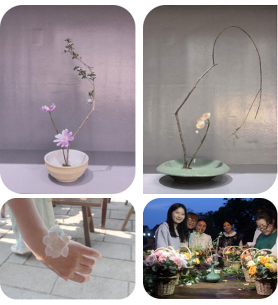 浙江省湖州藝術與設計學校木棉文創工作室的師生還在現場進行了系列的非遺展示活動,包括宋韻文人插花和花藝插花等,在小橋流水旁的雅桌上,吸引著游客的目光。與此同時,現場還展示了一些搭配非遺絨花制作而成的遮陽帽和手腕花,將傳統非遺技術與現代生活需求相融合,真正實現了讓古典藝術的美回歸到日常生活本初。