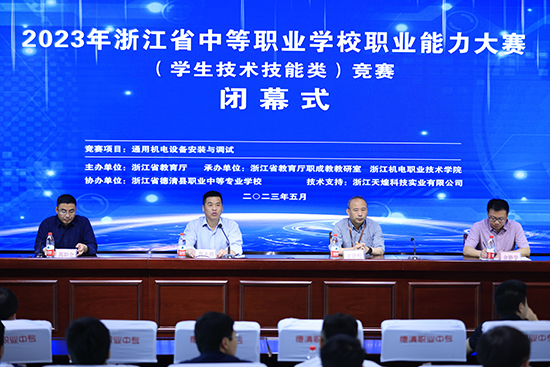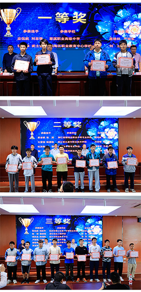 參賽選手們憑借扎實的理論功底和豐富的實操經驗,展現出精湛的技術水平和良好的精神風貌。經過激烈角逐,慈溪職業高級中學、鎮海區職業教育中心學校選手獲一等獎;浙江省德清縣職業中等專業學校、浙江省永康市職業技術學校、嘉善縣中等專業學校、杭州市臨平職業高級中學選手獲二等獎;杭州市蕭山區第一中等職業學校、浙江信息工程學校、紹興市職業教育中心、舟山職業技術學校、溫州市職業中等專業學校、嘉興技師學院選手獲三等獎。浙江機電職業技術學院繼續教育學院原院長倪志明教授,德清職業中專黨委副書記、副校長(全面負責)王法松等協辦方領導出席閉幕式并為獲獎選手頒獎。