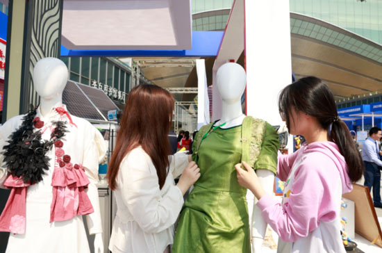 位于展位右側的高級“時裝秀”也深受參觀者的青睞。這些時裝都是時尚設計學院學生親手設計的優秀作品,色澤亮麗、造型優雅、創意十足,彰顯嘉職學子的朝氣蓬勃和工匠精神。