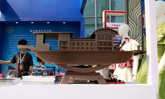 此次嘉興職業技術學院展位展出內容分4個板塊,分別是人才培養、產教融合、科教融匯、社會服務及各類實物。走進展位,引入眼簾的便是位于C位的紅船模型。這是由航空與軌道學院、智能制造學院師生與校企合作單位歷時8個月完成的佳作。紅船模型用鋁合金制作而成,利用數控技術“雕琢”船身零部件,經表面加工裝配后成型。其精美的設計、精湛的做工展現了紅船旁的高職院校的創新擔當。