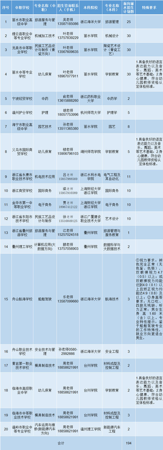 答:今年中本一體化人才培養面向麗水市招生194人,相較2022年增加了89個名額!今年共20所試點學校面向我市初中畢業生招生,相較2022年增加了13所!招生計劃奉上!快拿出小本本列出你心中的理想學校!
