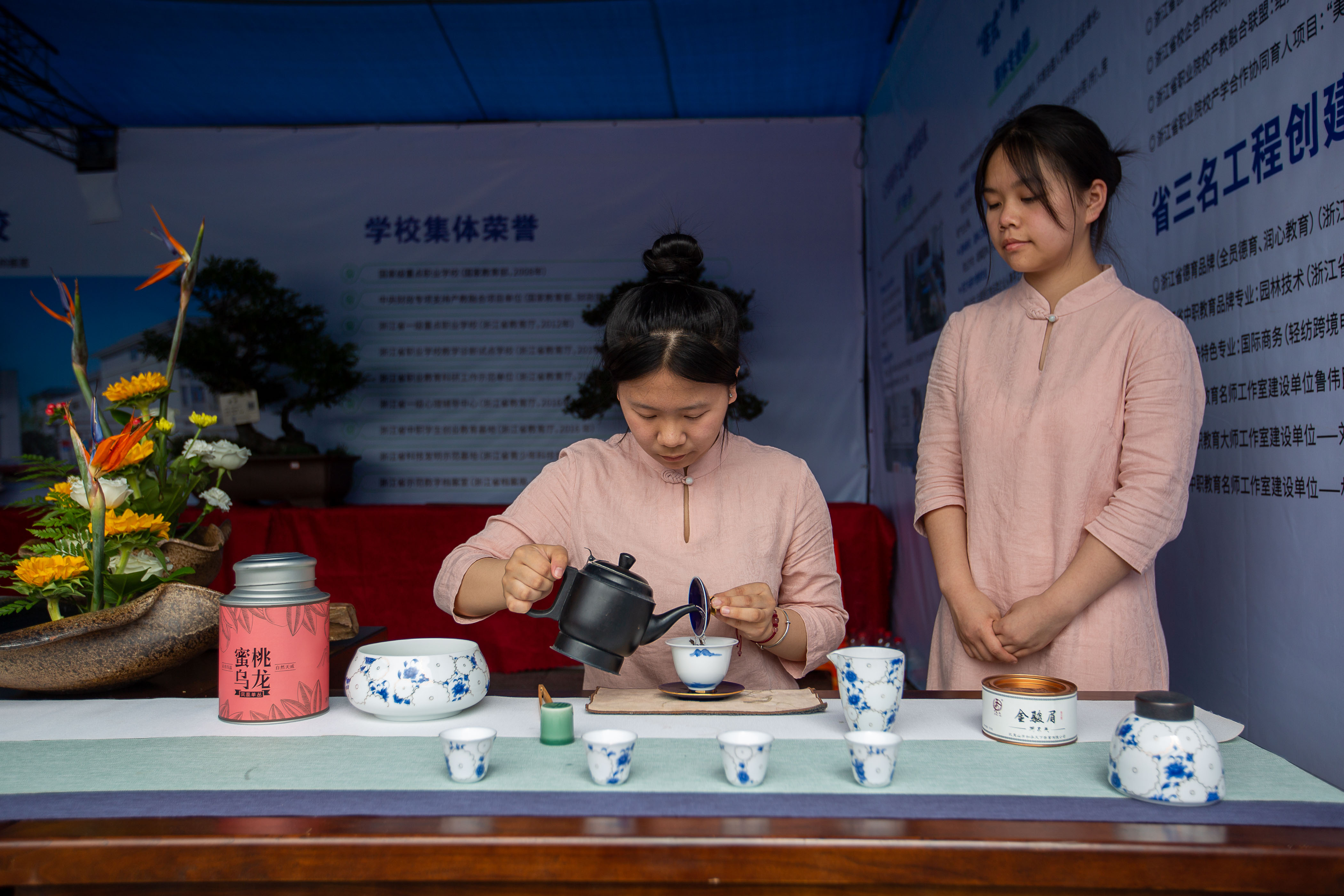 花語芬芳,茶語彌香。一個個設計概念豐富,意境典雅的插花作品,在茶香繚繞中,展示出了園林專業學生在花材擇選、插花設計、茶葉品鑒以及茶藝花藝禮儀運用等方面的園林專業能力與素養。