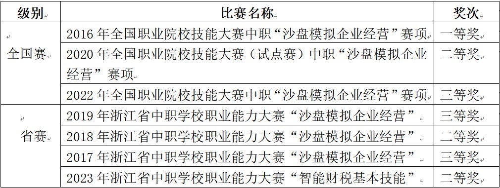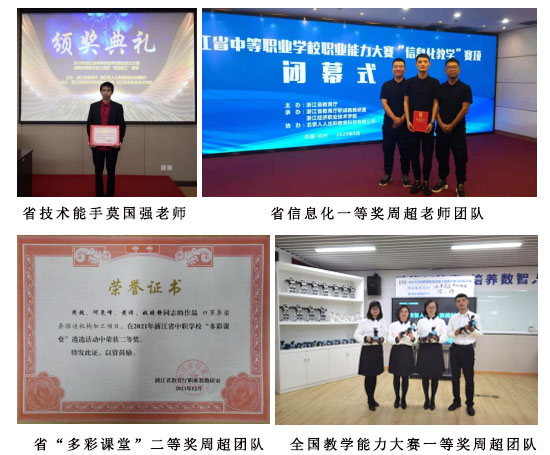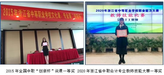 教師教學(xué)業(yè)務(wù)、專業(yè)技能水平突出,多次在各級(jí)各類的賽事中獲獎(jiǎng)。如:2015年全國(guó)中職“創(chuàng)新杯”教師信息化教學(xué)設(shè)計(jì)與說(shuō)課比賽中,嚴(yán)侃老師獲一等獎(jiǎng);2020年浙江省中職會(huì)計(jì)專業(yè)教師技能大賽中,劉芳芳老師獲一等獎(jiǎng)(第一名)、沈慧娟老師獲二等獎(jiǎng)。