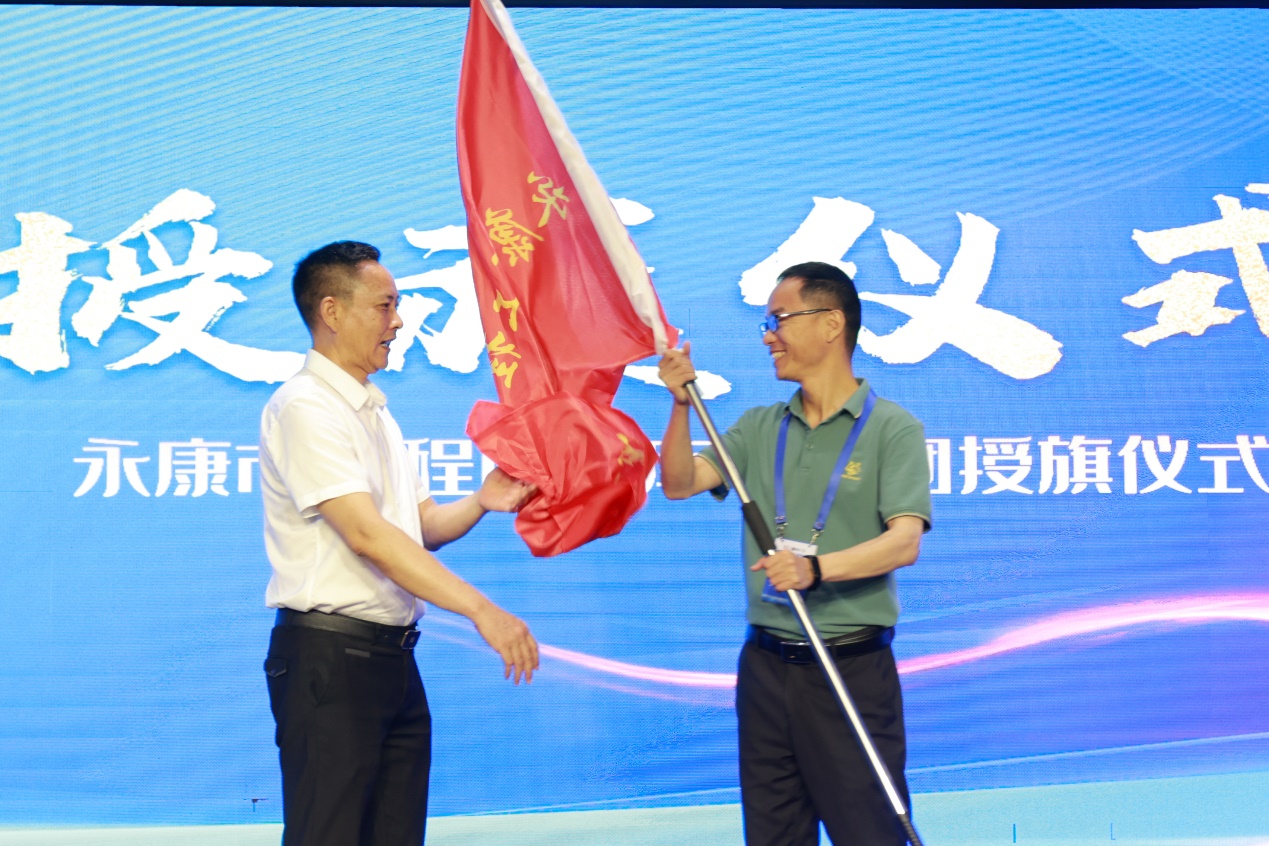 在熱烈的掌聲中,永康五金技師學院博士后工作站負責人、智庫服務團團長胡天喜博士從永康市人社局黨組書記、局長曹法余手中接過旗幟,宣布正式成立“永康市工程師智庫服務團”。