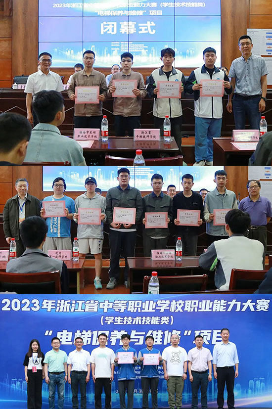 此次大賽由浙江省教育廳主辦,浙江省教育廳職成教教研室和浙江工業大學職業技術教育學院共同承辦。全省各地市共選送9支參賽團隊參加本次賽項。比賽共分電梯保養和電梯維修兩個模塊。經過現場抽簽、設備自檢后,由雙人組合形式進行維保比賽,裁判員全程跟隨選手檢測,仔細查看每一組選手并逐一打分。經過激烈的競技角逐,柯橋區職業教育中心高水冬、方苗林老師指導的秦士成、李豪淇同學,最終,以穩定的狀態、嫻熟的技術、配合默契的風貌展現出極高的職業素養和技能水平,獲得評委一致好評,成功奪冠,挺進國賽!