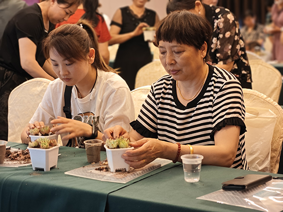 在花草種植培訓環節,園藝專家帶領學員現場“擺弄”花草、種植“多肉”,并學習土壤選擇、肥料使用、病蟲害防治等技巧,學員們心情愉悅,化身辛勤細致的“園丁”。