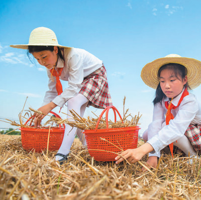 江蘇省海安高新區(qū)實(shí)驗(yàn)小學(xué)開(kāi)展“熱愛(ài)勞動(dòng) 珍惜糧食”教育活動(dòng),少先隊(duì)員在麥田里撿拾散落的麥穗。