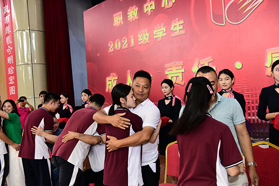 隨后,在周一妹老師的領誓下,全體高二學生面對國旗,莊嚴宣誓。在感恩父母環節,學生代表上臺向父母行鞠躬禮,獻感恩茶。在這個特殊的時刻,讓同學們感恩父母,感謝家長賦予孩子生命,感謝家長撫育孩子成長。老師是園丁,育得桃李芬芳;學生是花朵,在精心澆灌下茁壯成長。站在成人的門檻上,班主任老師們又送來了成人寄語。朝夕相伴了兩年,一束鮮花,一個擁抱,一切盡在不言中。21電商1班王婷婷作為學生代表發表成人心聲,她感謝兩年來父母、老師、同學、學校給予的支持與愛,在未來的日子,自己將懷揣著夢想,緊握著希望,挺起堅實的胸膛,昂首面對已經成年的自己,在未來的人生之路上,披荊斬棘,挑戰極限。21計4鐘凱怡父親鐘正平作為家長代表上臺發言,他希望每一位同學要學會獨立思考世界、感受生活、實踐目標,同時學會如何愛護自己、尊重他人、遵守社會公德,并且學會帶著感恩和欣賞的眼睛來發現這個世界的美好。孫良杰代表學校深情寄語。孫校長希望全體高二學生在以后的人生道路上,多掌握生存的技能、多學習生活的知識、多理解生命的意義,在青春時用腳步丈量世界,用眼睛發現美好,用耳朵傾聽呼聲,用內心感應變化,把對家國血濃于水、與時代同呼吸共命運的情感貫穿學業全過程、融匯在事業追求中。