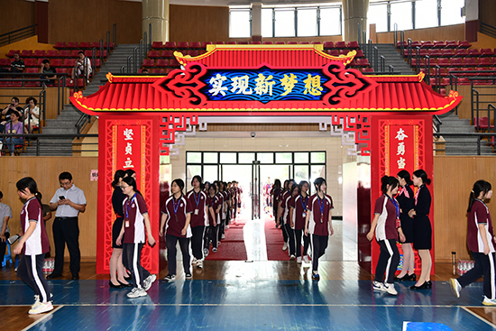 楊藝超宣布2021級學生成人門儀式正式開始,在背景音樂中,同學們排著整齊的隊伍緩緩入場。同學們和班主任手挽手,一起邁著堅實的步伐,從寫著“邁入成人門,實現新夢想”的巨大成人門下走過,象征著同學們跨過十八歲的門檻,即將成長為有責任感、有感恩心、有奉獻精神的新公民。