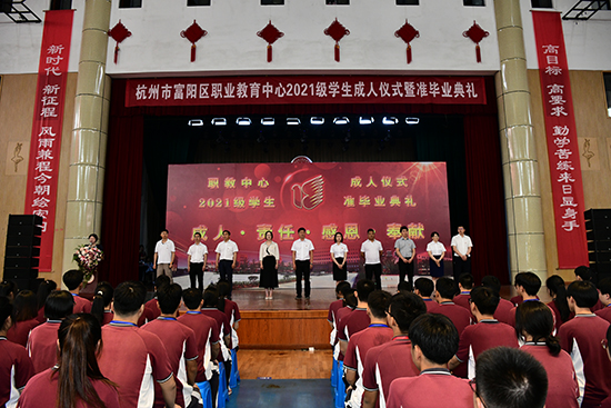 6月16日上午,富陽區職教中心2021級學生成人儀式暨準畢業典禮在體藝館舉行。富陽區教育局團工委副書記楊藝超,富陽區人民法院刑庭法官駱芝媛,學校黨委書記、校長孫良杰等學校領導和各班班主任及部分家長代表參加此次活動。儀式由校團委副書記倪夢霞主持。