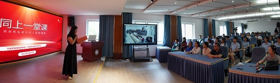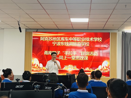 這是“甬庫”同上思政課的其中一個環節。6月20日下午,新疆阿克蘇地區庫車中等職業技術學校和寧波東錢湖旅游學校共80余名師生相約“云端”,邀請寧波鄞鈴宣講團3位成員為兩校學子開啟精彩紛呈的跨越時空的思政課。兩校相關領導,教務、德育、旅游教研組等部門負責人參加。