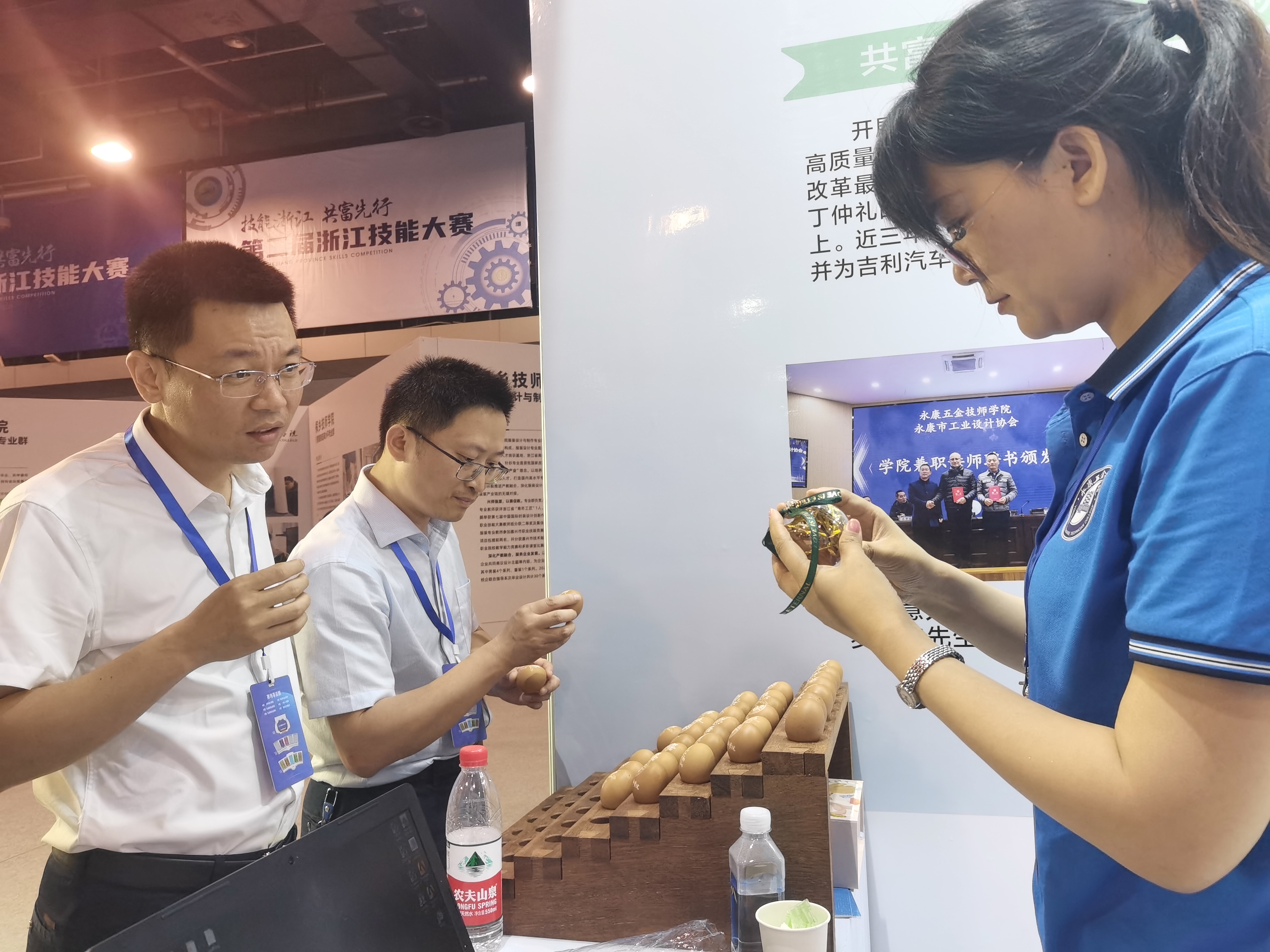 在永康五金技師學院展區,精美的精雕作品、3D打印作品、模具、工裝夾具、五金主題素描作品閃爍著永康五金的智慧。