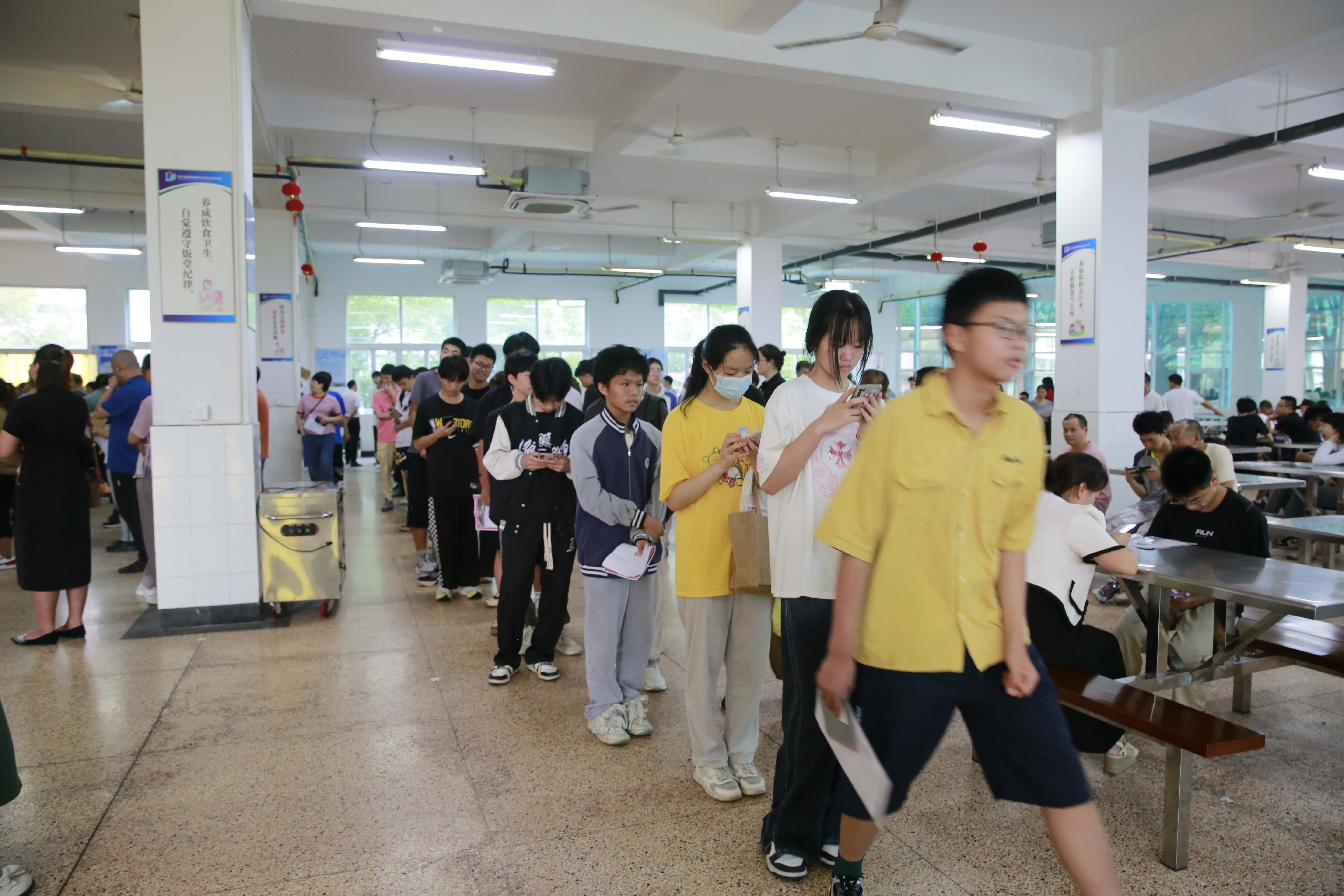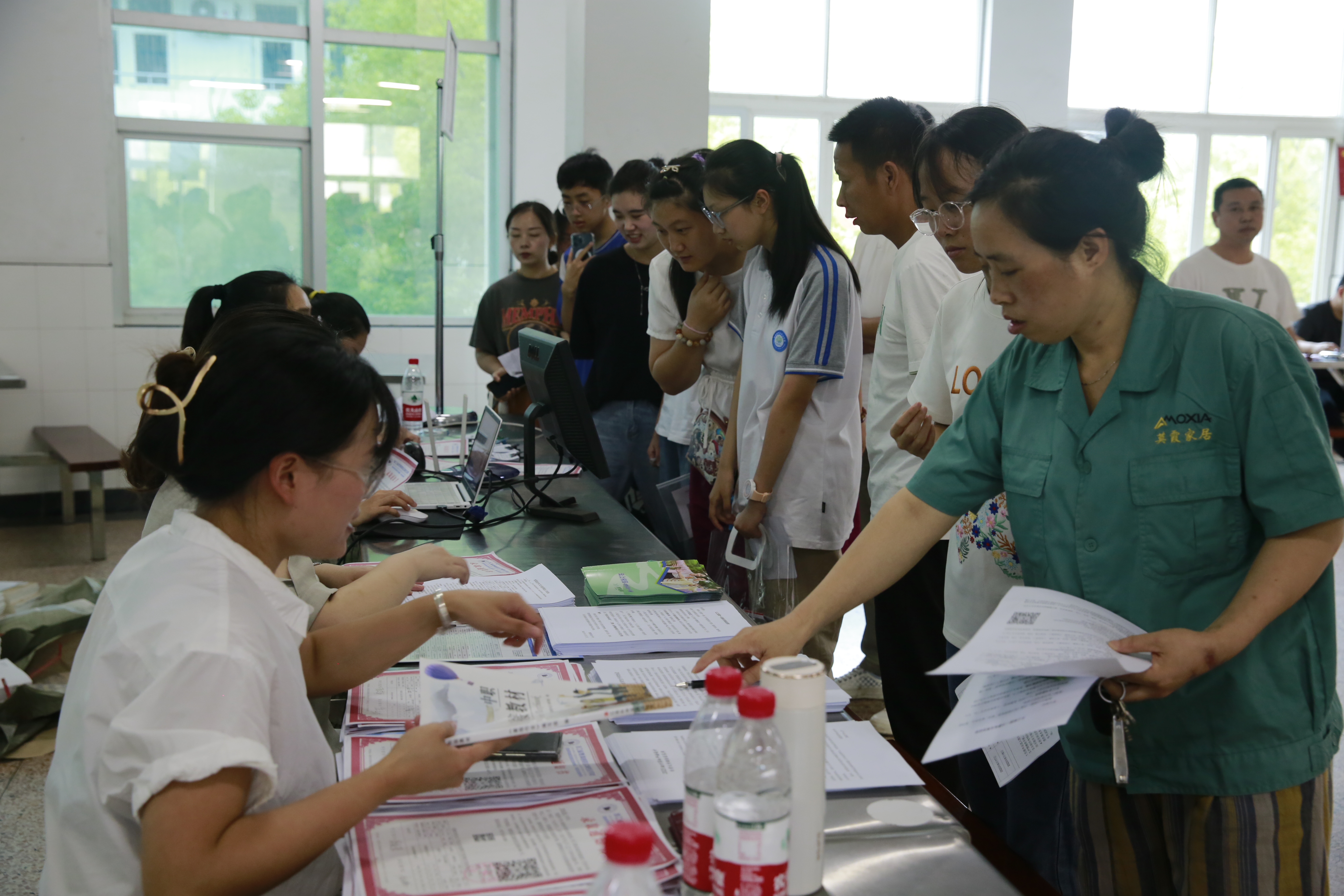 報名現場,秩序井然,有條不紊。學生家長在食堂一樓排隊取號,定時定量放號;食堂二樓工作人員耐心解答,細心審核,精準錄入,新生們在相應專業的報名窗口順利完成報名。