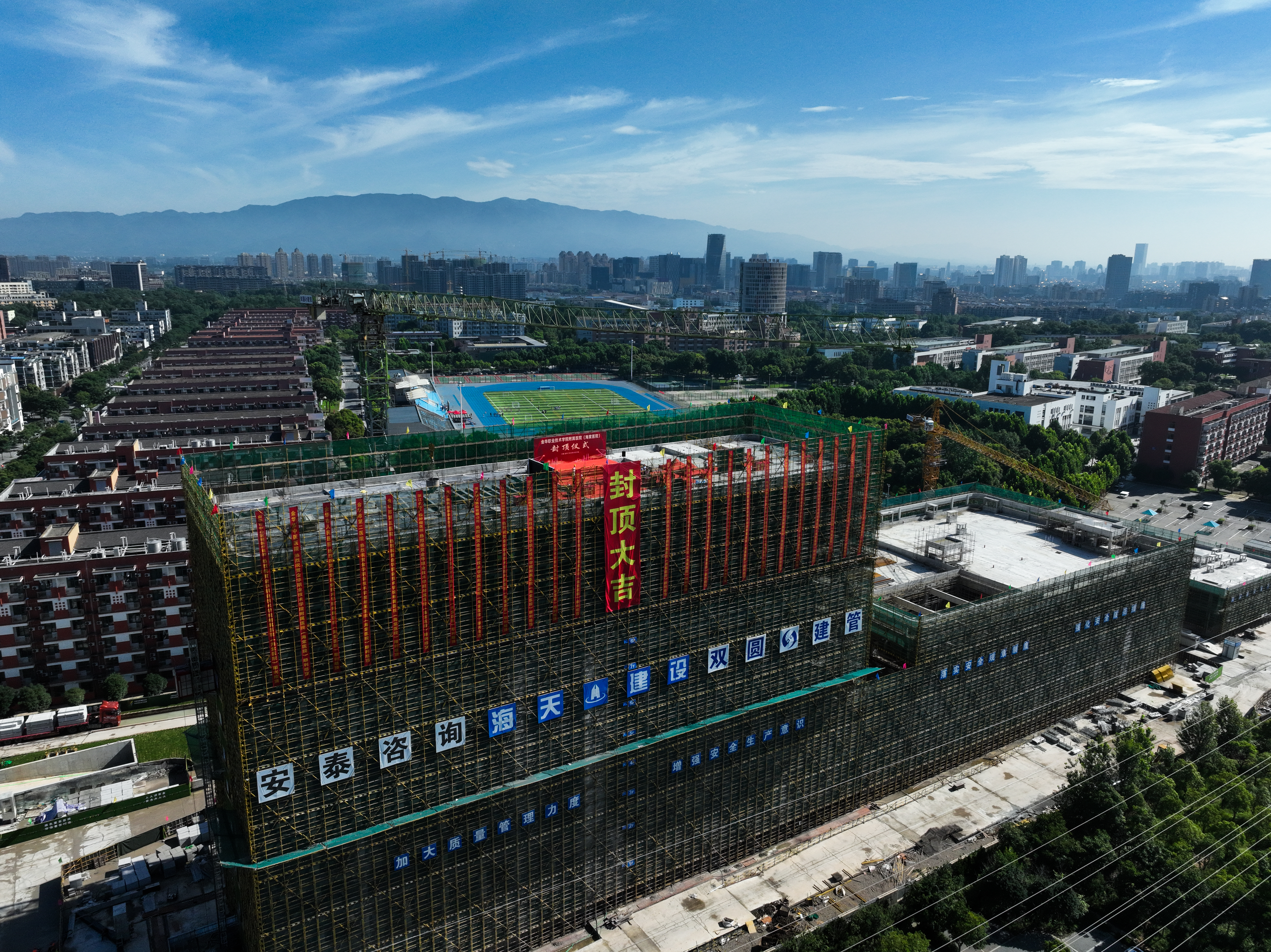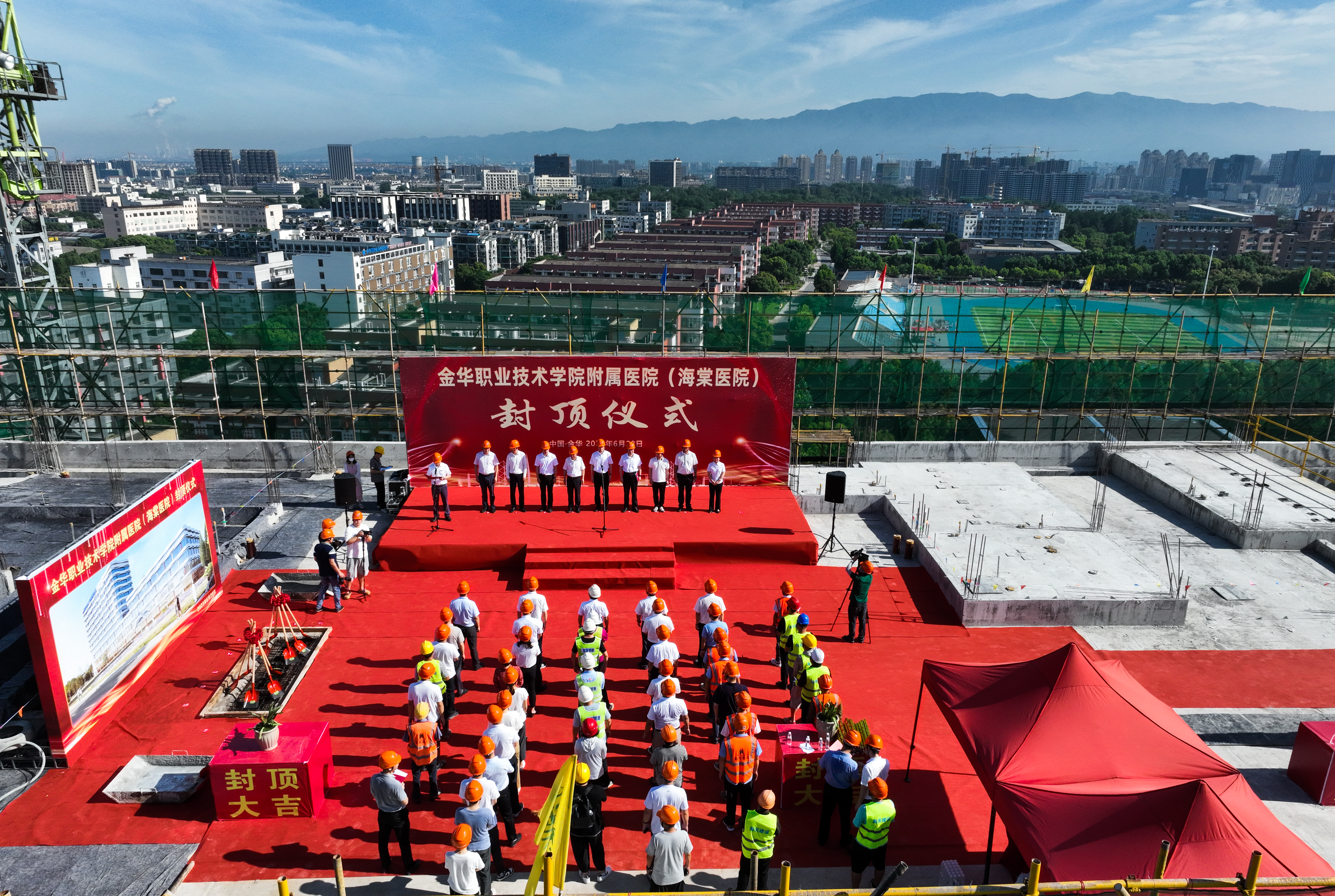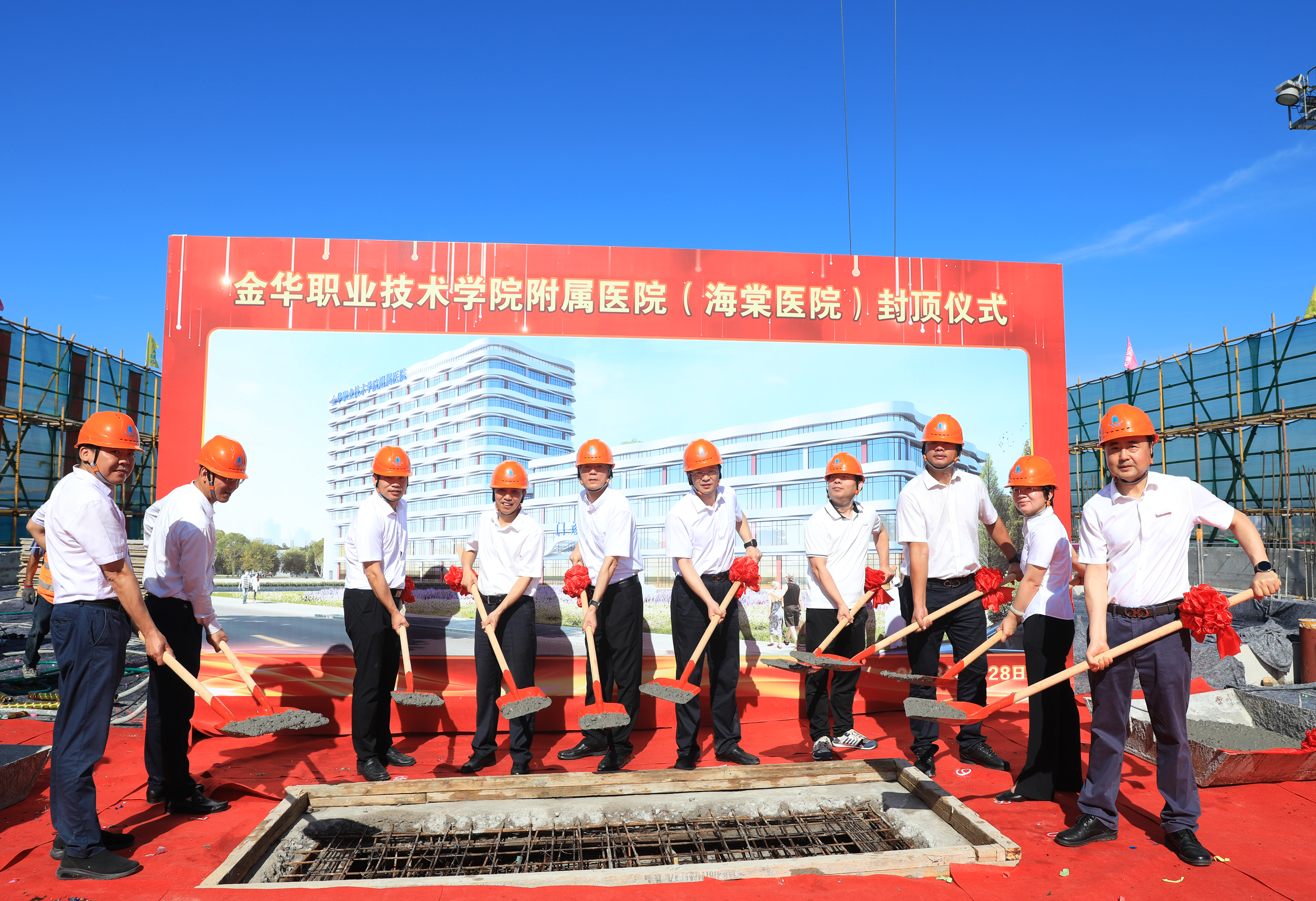 “在金華市委市政府以及相關部門的關心幫助和大力支持下,學校附屬醫院(海棠醫院)項目克服了疫情管控、高溫酷暑、臺風暴雨等不利因素,嚴排施工計劃,加班加點施工,實現了主體結構封頂,比計劃提前了2個月。”金華職業技術學院黨委書記王振洪表示。