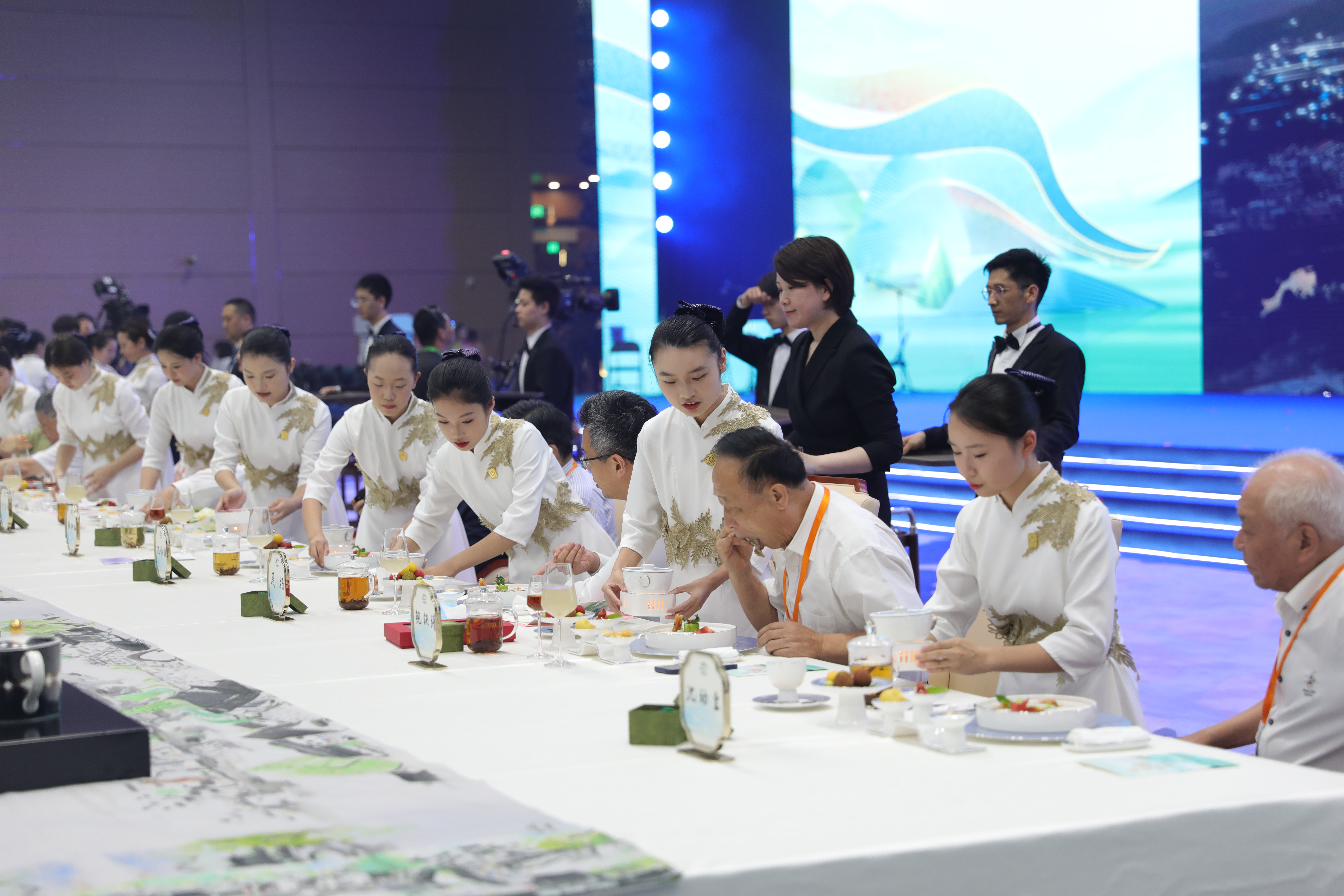 本次晚宴服務堪稱“國宴”規格,體現了對各位鄉賢的禮遇。步伐適中,抬頭挺胸,身著黑色燕尾服的男生負責晚宴中的上菜服務。身著金絲孔雀服的漢系服裝女生則是負責主桌嘉賓的晚宴服務工作。大會現場,個個精神飽滿、面帶微笑、動作優雅、非常自信。