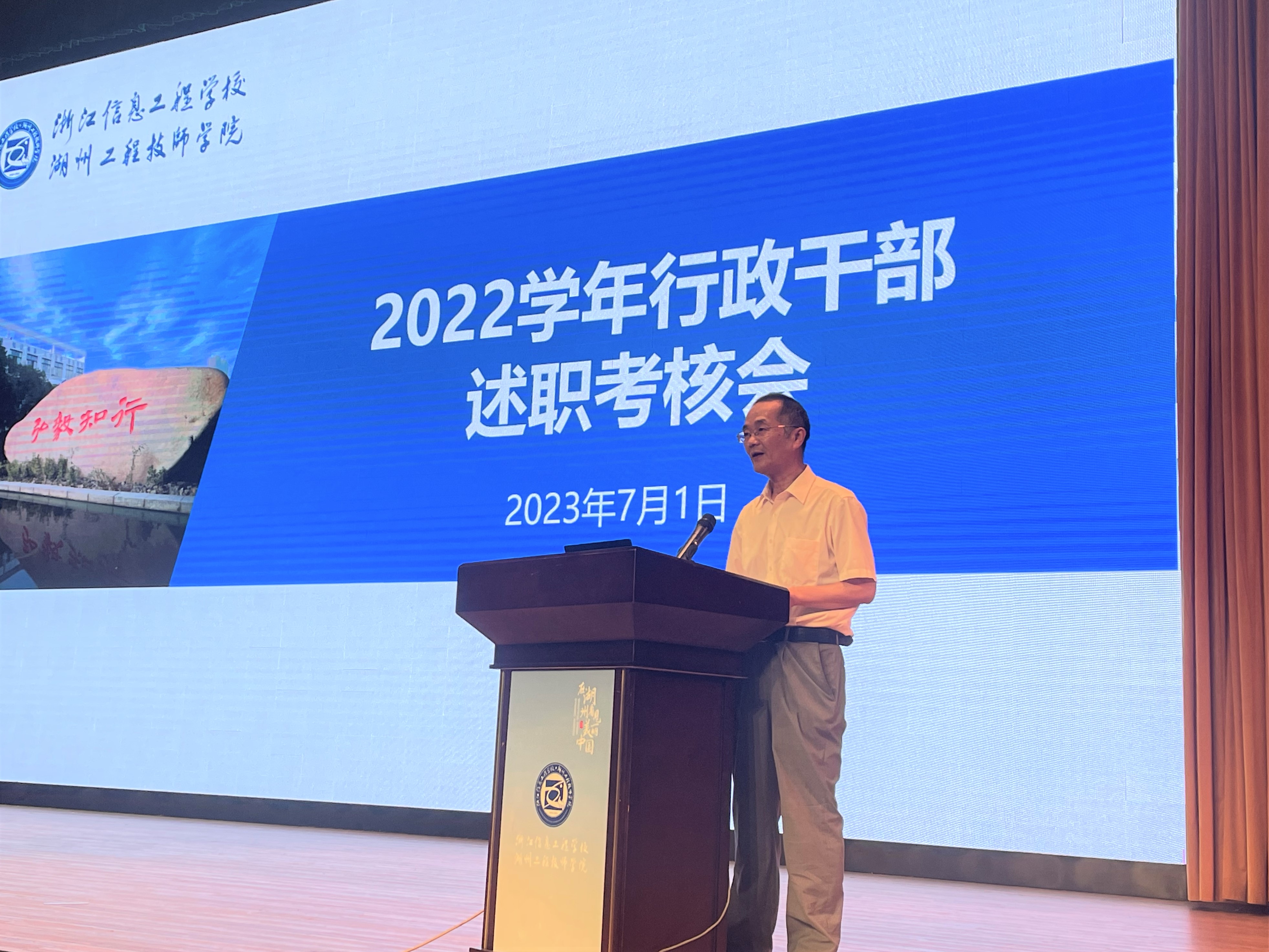 為切實加強各處室、專業部干部隊伍建設,進一步激勵提升廣大干部履職盡責、干事創新的積極性,促進全校教職工對行政干部工作的理解及支持,7月1日下午,浙江信息工程學校·湖州工程技師學院在校大會堂召開2022學年行政干部述職考核會。會議由副校長湯方榮主持。湖州市教育局職成教處副處長馬玲玲、浙江省湖州藝術與設計學校黨委書記唐海佺及學校專業部五位教師代表應邀擔任評委,學校全體教職工參加會議。