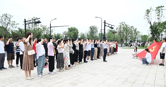 全體黨員同志在杭州國家版本館入口處集合,在校黨委書記、校長王小林的帶領下,面向黨旗莊嚴宣誓,堅定入黨初心。學習第一議題,習近平總書記在日前召開的文化傳承發展座談會上強調,在新的起點上繼續推動文化繁榮、建設文化強國、建設中華民族現代文明,是新時代新的文化使命。要堅定文化自信、擔當使命、奮發有為,共同努力創造屬于我們這個時代的新文化,建設中華民族現代文明。
