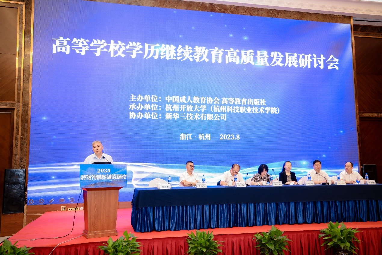 8月26日,由中國成人教育協(xié)會(huì)、高等教育出版社主辦,杭州開放大學(xué)(杭州科技職業(yè)技術(shù)學(xué)院)承辦、新華三技術(shù)有限公司協(xié)辦的“高等學(xué)校學(xué)歷繼續(xù)教育高質(zhì)量發(fā)展研討會(huì)”在杭州召開。中國成人教育協(xié)會(huì)副會(huì)長(zhǎng)江波、趙躍進(jìn),高等教育出版社副總編輯龍杰,杭州開放大學(xué)(杭州科技職業(yè)技術(shù)學(xué)院)黨委書記謝列衛(wèi)、校長(zhǎng)溫正胞,杭州市教育局副局長(zhǎng)孫青峰出席會(huì)議,教育部職業(yè)教育與成人教育司高等繼續(xù)教育處副處長(zhǎng)徐璐以“新時(shí)代高等繼續(xù)教育高質(zhì)量發(fā)展的形勢(shì)與任務(wù)”為題作主旨報(bào)告。來自全國各地高校相關(guān)領(lǐng)導(dǎo)、繼續(xù)教育工作相關(guān)負(fù)責(zé)人、知名專家學(xué)者及教師代表等近300人現(xiàn)場(chǎng)參加會(huì)議,共同探討繼續(xù)教育高質(zhì)量發(fā)展建設(shè)之路。