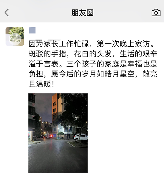 “因為家長工作忙碌,第一次晚上家訪。斑駁的手指,花白的頭發,生活的艱辛溢于言表。三個孩子的家庭是幸福也是負擔,愿今后的歲月如皓月星空,敞亮且溫暖!”8月26日晚,剛剛結束家訪的浙江省湖州藝術與設計學校沈曉飛老師在微信朋友圈分享了家訪后的動情感悟。無獨有偶,學校計旭霞老師也在家訪心得體會中記錄下小張父親的嘆息和對家庭教育指導的迫切需要。
