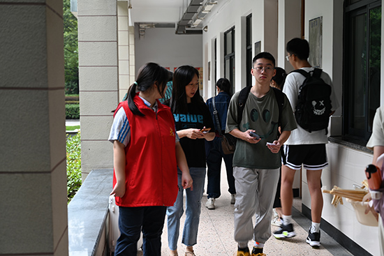 進入校園后,高一新生及家長在志愿者的引領下,查看分班情況,前往教學樓各班級教室報到、辦理手續。