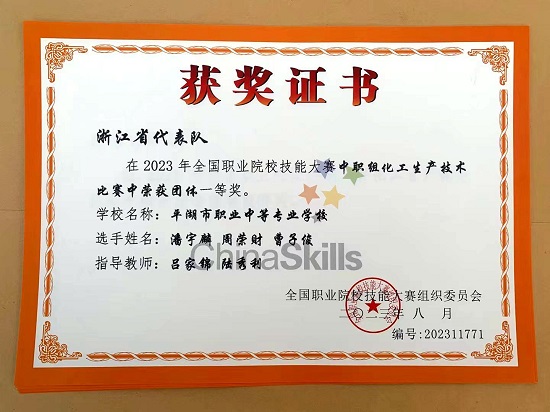 8月26日至30日,由國家教育部、國家發展改革委等多家單位主辦,全國石油和化工職業教育教學指導委員會等單位協辦的2023年全國職業院校技能大賽(中職組)化工生產技術賽項在淄博市工業學校舉行。平湖職業中?;瘜W工程部原高三12班的周榮財、潘宇麟、原高二9班的曹子俊三位學生組成的浙江省代表隊,在呂家錦、陸秀利、沈張迪三位老師的精心指導下,齊心協力,奮勇進取,蟬聯全國技能大賽團體一等獎。