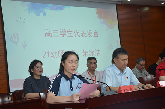 高三學生代表21幼師1班朱冰潔同學代表全體高三對高考立下了雄心壯志,她說,夢想是要努力去實現(xiàn)的,但學習的過程也要經(jīng)得起風吹雨打,“吾生也有涯,而知也無涯”。同時,她也為高一、高二的學弟、學妹們獻出了自己的學習經(jīng)驗和學習方法。