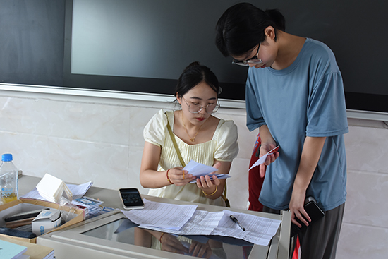 “你好,我們是志愿者,我帶你去報到場地”“新生,你好,行李我幫你拿”“你好,同學,我帶你去匠心樓領取生活用品和校服”“同學,你好,我帶你去寢室,請往那邊走”……