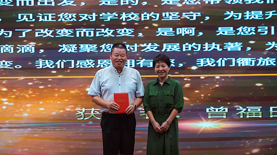 “今天,我們還有一個特別的獎需要頒發……我們感恩擁有你,衢旅領航人!”在主持人動情的頒獎詞中,衢州旅游學校黨支部書記、校長曾福田在驚喜與掌聲中,接過管理團隊為他頒發的意外獎項“校長特別獎”。這是一場有“預謀”的頒獎典禮:表彰優秀教師,也要為校長頒獎。