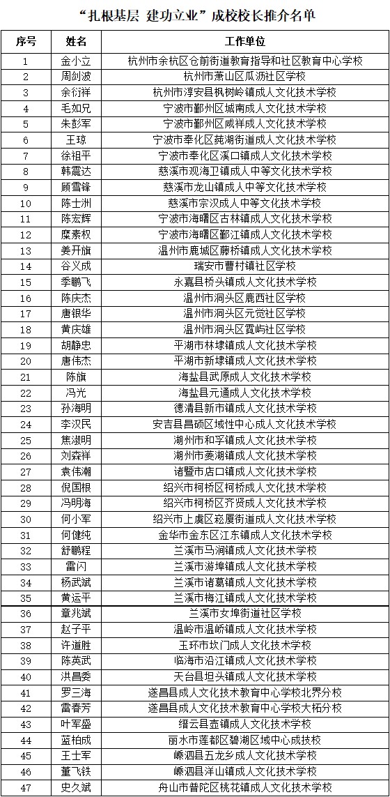 根據《關于開展“扎根基層 建功立業”成校校長推介活動的通知》(浙成職協〔2023〕15號)要求,在各地推薦、審核基礎上,經省成職教協會復核,現將“扎根基層 建功立業”成校校長推介名單予以公示。